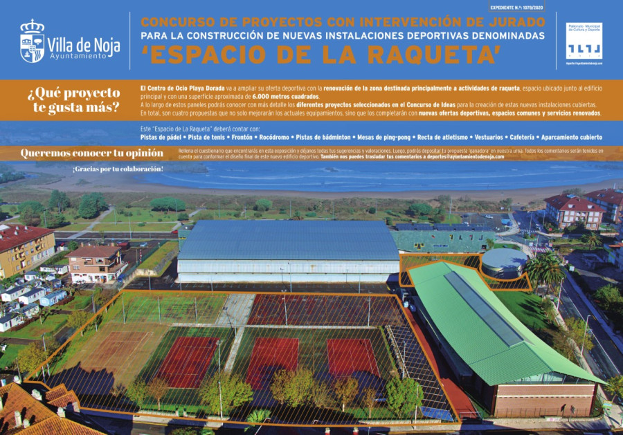 El Ayuntamiento de Noja dará a conocer el próximo lunes, 3 de abril, el proyecto elegido para desarrollar el futuro espacio ?La Raqueta? del Centro de Ocio Playa Dorada, una renovación integral de las instalaciones con la que se ampliará la oferta deportiva del municipio.