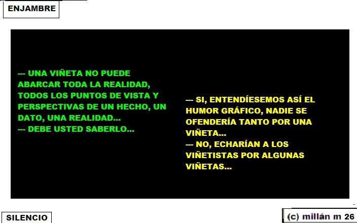 - Viene como noticia, no pondré su nombre, para no perjudicarla, que en ARCO una pintora de un país de Asia, no diré tampoco el nombre de dicha sociedad, ha expuesto una serie de pinturas, que podemos estar de acuerdo o en desacuerdo, pero que expresa que en su sociedad-país por esos cuadros estaría condenada a muerte. Por lo cual es claro y evidente, que jamás podrá volver a su sociedad. Uno, cree que ya una pintura o un dibujo o una fotografía, o el arte plástico, ya no llevan a la muerte. Pero parece ser que sí.