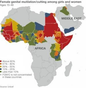 Quiero a través de este artículo denunciar una práctica ancestral, horrorosa, inhumana, asquerosa y cualquier adjetivo que a uno se le pueda ocurrir, la llamada ABLACION ó MUTILACION GENITAL, que hoy en día amenaza a mas de 30 millones de niñas en África Oriente Medio y algún otro continente como Europa, en total unos 29 países concentrados en estas zonas y que se espera que en este año 2014, dos millones de niñas la padezcan, Esta práctica ya la han sufrido más de 125 millones de mujeres a lo largo de la historia. Somalia, Guinea, Egipto y Etiopia, son los que lideran esta macabra práctica. Egipto, con 27,7 millones, es el primero en la lista, seguido de Etiopía con 23 millones.