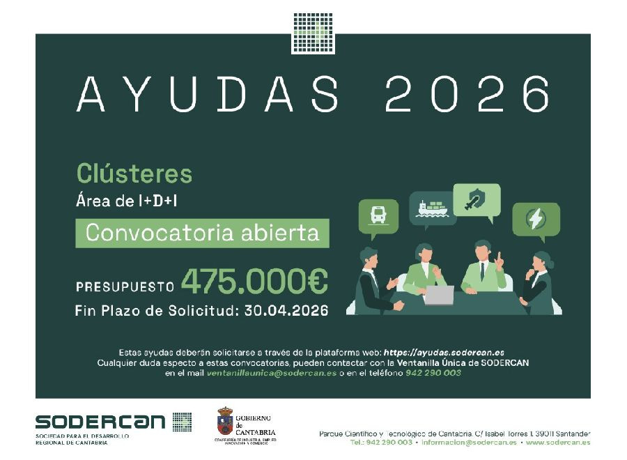 La Sociedad para el Desarrollo de Cantabria, SODERCAN, adscrita a la Consejería de Industria, Empleo, Innovación y Comercio del Gobierno de Cantabria, ha lanzado la convocatoria anual de ayudas para los clústeres sectoriales de la Comunidad Autónoma, con un presupuesto de 475.000 euros.