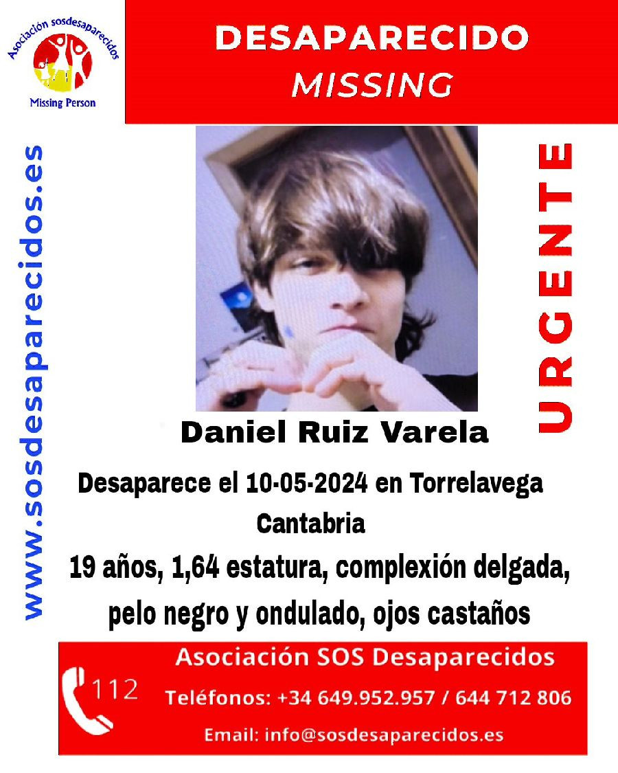 Se trata de Daniel Ruiz Varela, que desapareció el pasado 10 de mayo, viernes, en Torrelavega. Tiene 1,64 metros de estatura y es de complexión delgada, con pelo negro y ondulado y ojos castaños, según SOS Desparecido, que ha difundido un cartel con la alerta urgente por desaparición de este chico.