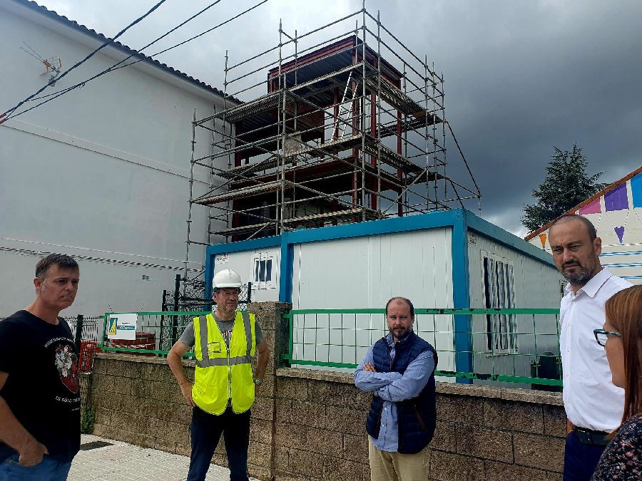 El alcalde, Javier López Estrada, acompañado por la directora del colegio Pancho Cosió, Macarena Pareja; y por el presidente del Ampa del centro, Iñigo Uriarte; ha visitado este viernes las obras del nuevo centro cívico, que dotarán a este pueblo y a la comunidad educativa del centro de un nuevo equipamiento del que carecen en la actualidad.