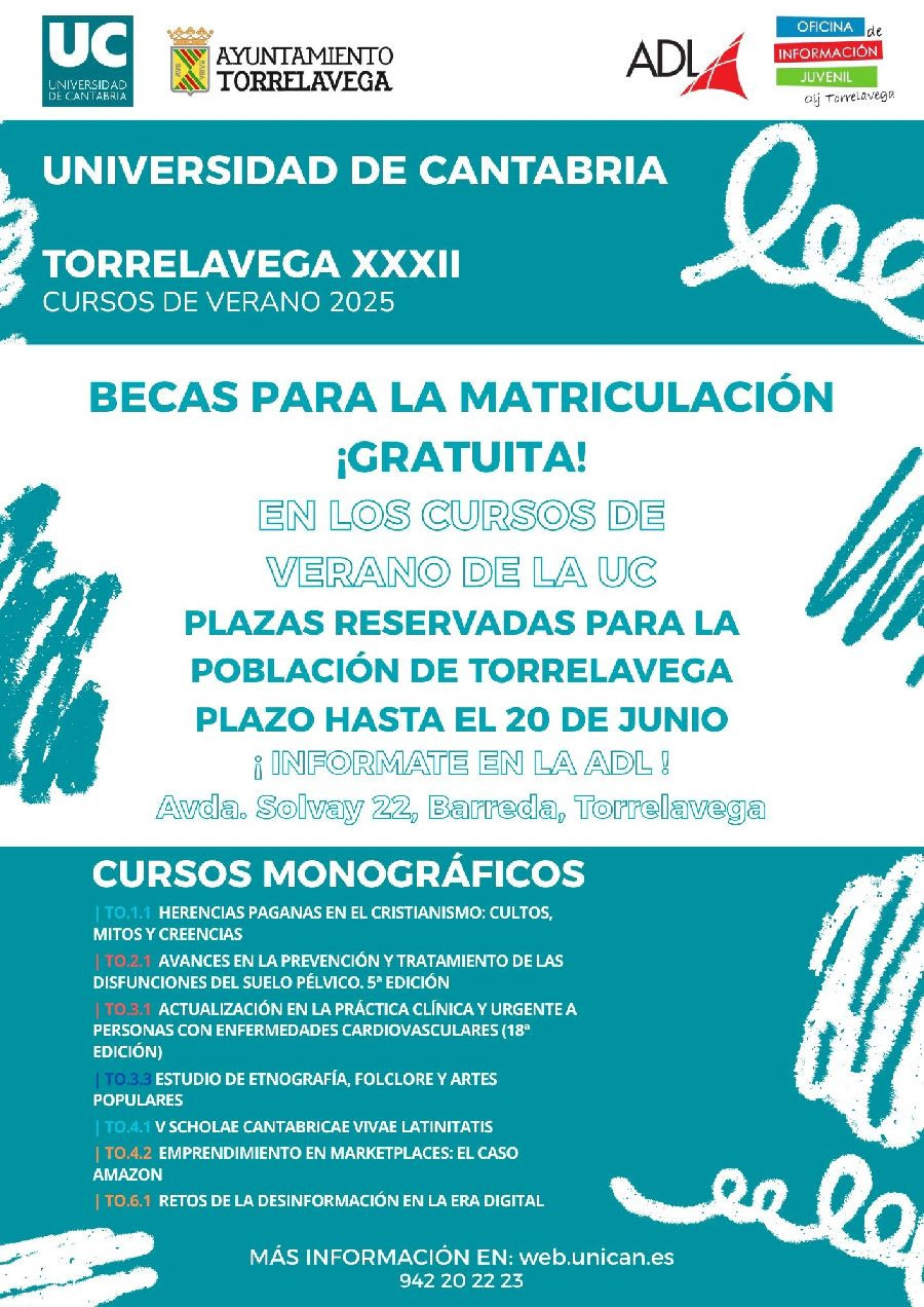 Este año se ofertan cinco becas dirigidas a personas empadronadas en Torrelavega, que permitirán cursar de forma gratuita cualquiera de los cursos programados en la 32ª edición de los Cursos de Verano de la UC.
