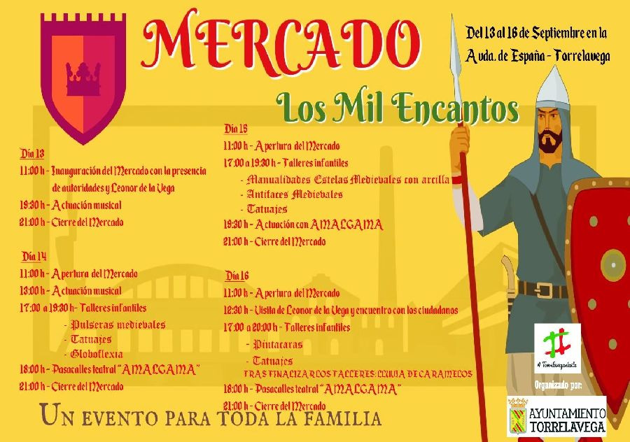 Torrelavega acogerá desde este sábado, 13 de septiembre, al martes el Mercado 'Los Mil Encantos', una nueva propuesta que se celebrará en la Avenida de España e incluirá diversas actividades gratuitas, como talleres, pasacalles, actuaciones musicales y un encuentro con doña Leonor de la Vega, una de las personas más importantes y decisivas en la fundación de la ciudad.