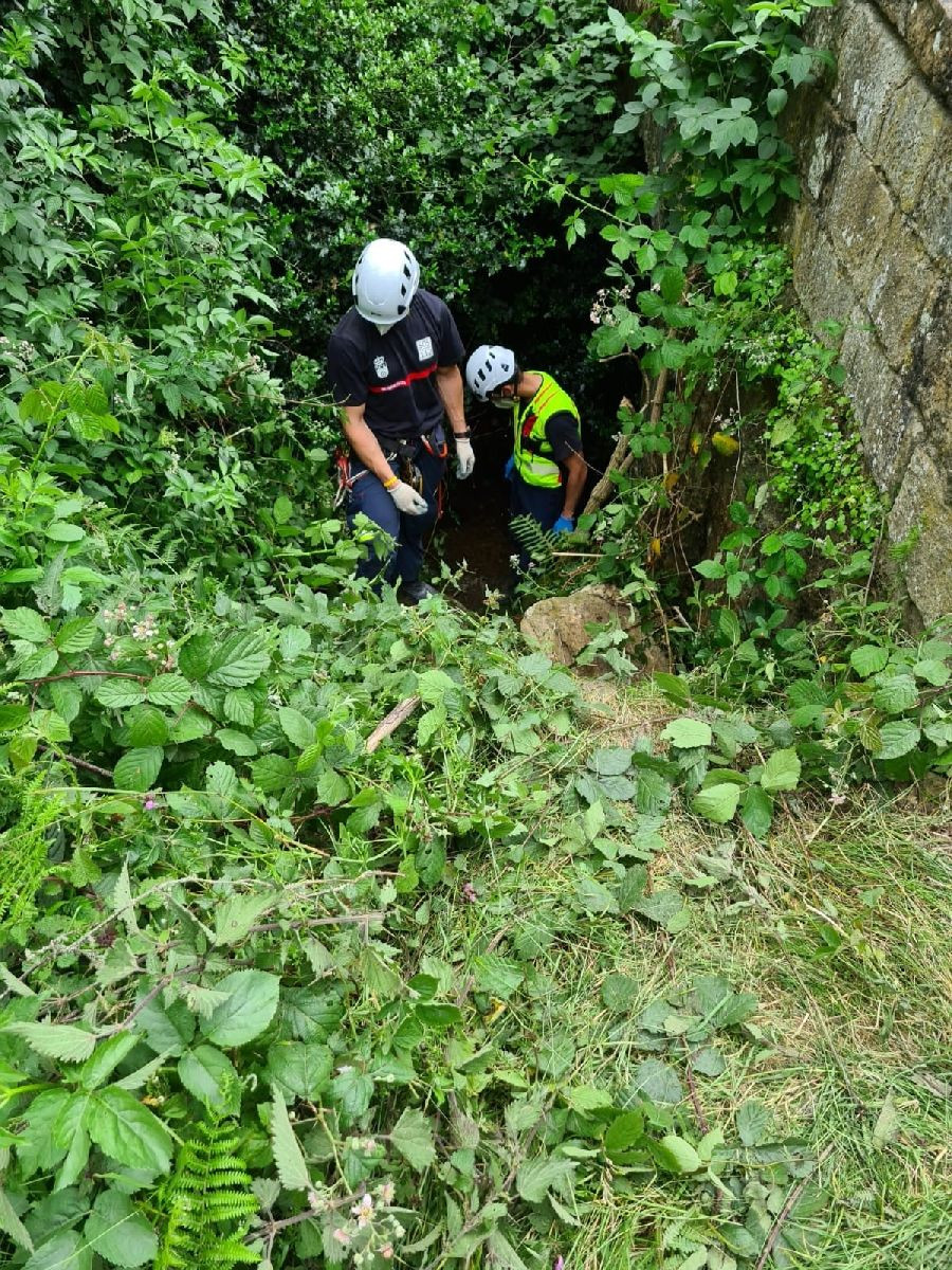 Una vez examinado por el equipo médico, los bomberos del 112 le han inmovilizado en un tablero espinal y han realizado un montaje de cuerdas para proceder a su extracción con técnicas de rescate vertical.